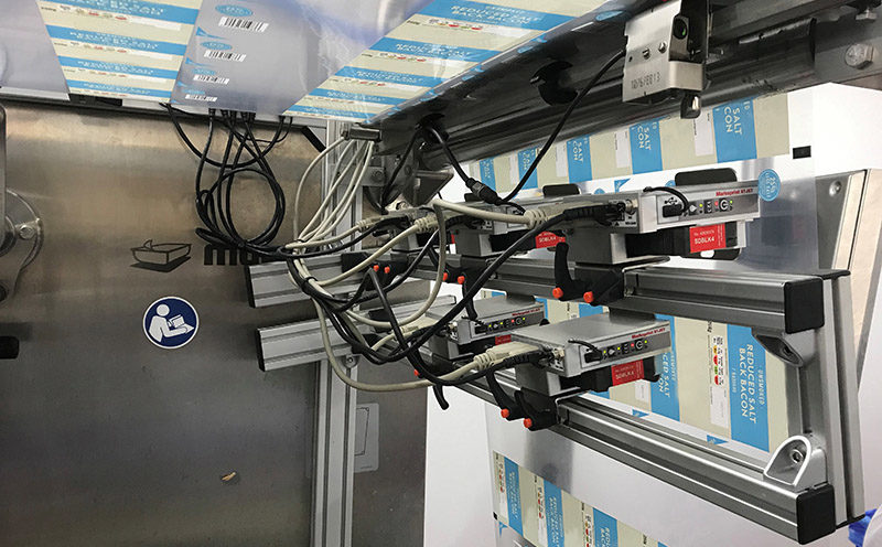 With the thermoformer producing ten packs per cycle (two packs long, five across), Rotech’s solution was to fit five X1 Jet TIJ printheads in a fixed position across the web to print the film as it passes through the machine, eliminating the need for an indexing system. The coders were installed in a staggered configuration on two frame assemblies, one below the other, with three on one row and two on the other. The film web is coded in a vertical position before being applied to the pack.