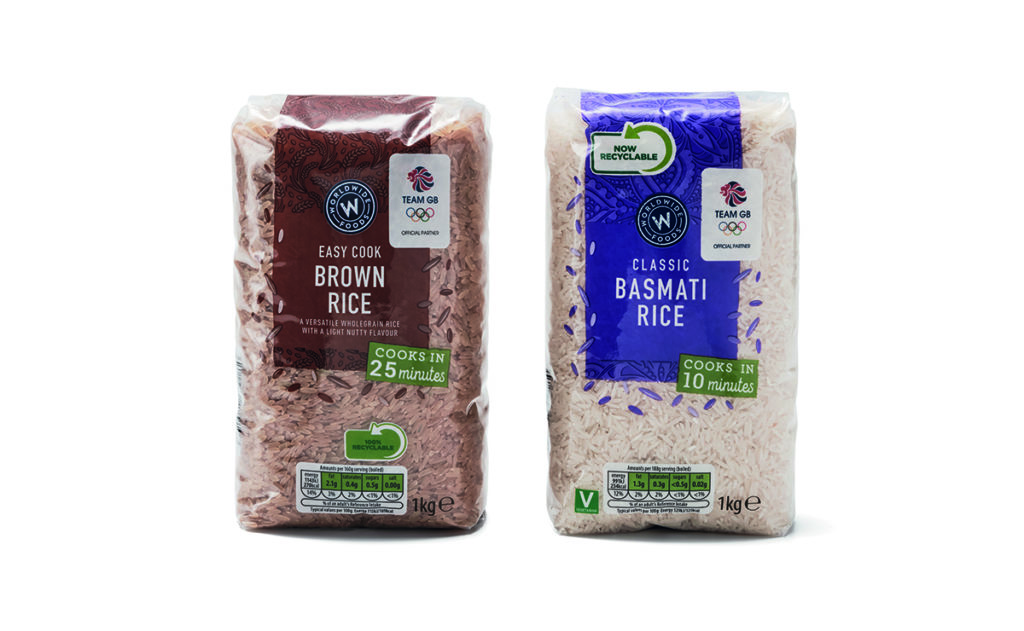 Previously packed in a non-recyclable, OPP to PE mixed laminate, Aldi has switched to the MonoFlexE monomaterial PE to PE laminate packaging for its own-brand Worldwide Foods 1kg basmati rice and 1kg brown rice SKUs.