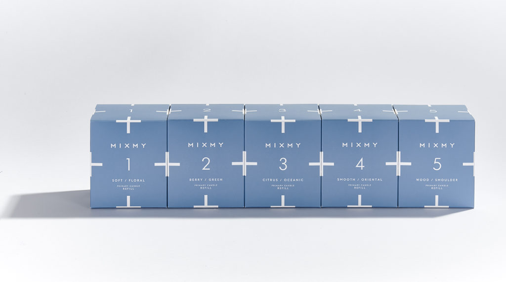 Both MIXMY primary candle and candle refill cartons were printed matt on Incada Silk FSC 590micron material. The designs included debossing and unvarnished plus signs, meaning Falconer had to ensure the print alignment of every carton had to be perfect so each plus sign aligns when multiple cartons are merchandised side-by-side.