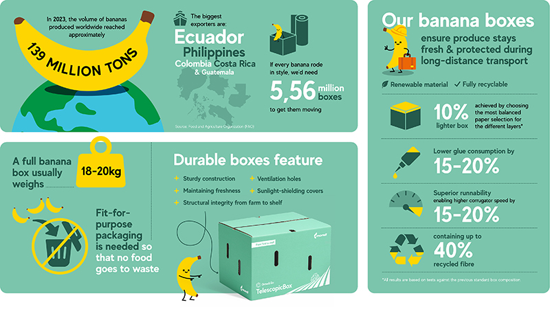 What followed was an international collaboration between Mondi, trading partner Europcell, Ecuadorian banana exporter Incarpalm, and a European importer. Together, the teams redesigned the structure and paper composition of the traditional banana box, testing multiple scenarios to balance durability, weight, and humidity resistance.