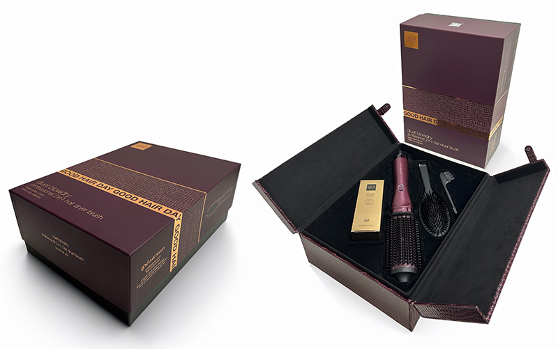 For the design of the boxes for hair dryers, straighteners, and other products, the look needed to represent the age of luxury travel, embodied by the crocodile-textured suitcase.